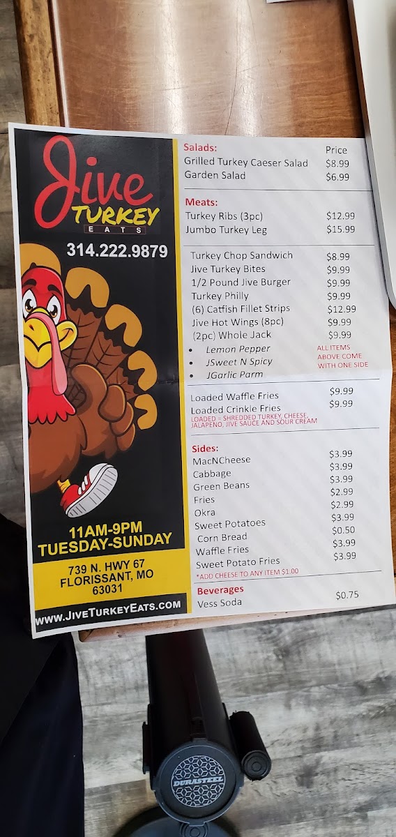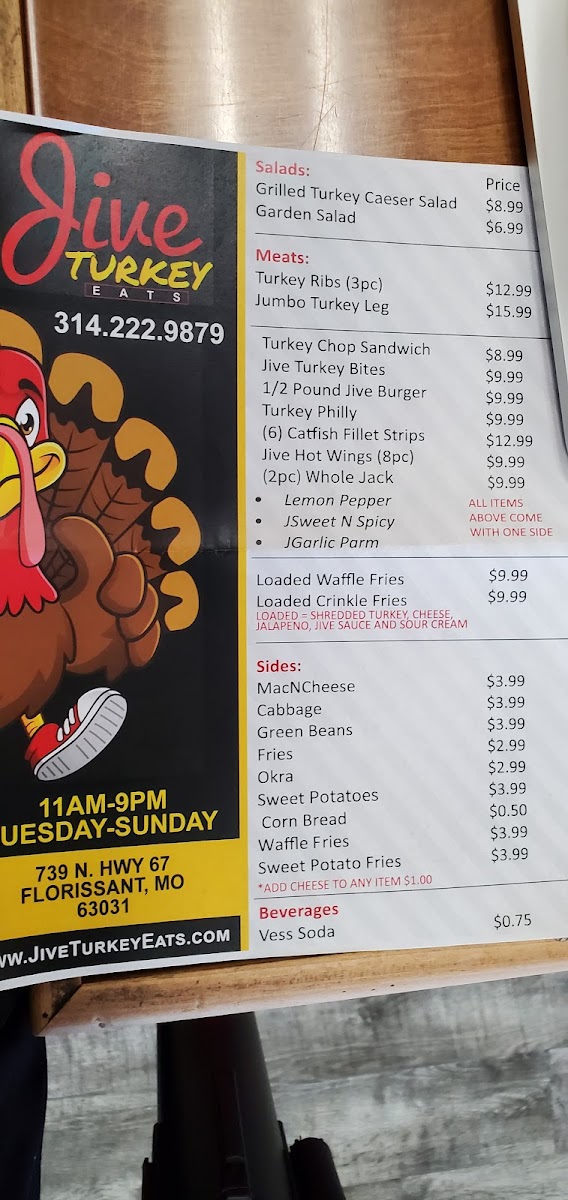 Welcome to Jive Turkey Eats, a culinary gem nestled in Florissant, MO, known for its delightful take on turkey-centered cuisine. The menu showcases an impressive array of dishes, from succulent turkey ribs to the hearty jumbo turkey leg, priced at just US$15.99. Each meal is crafted with care, ensuring freshness as it’s cooked to order, making it worth the wait.